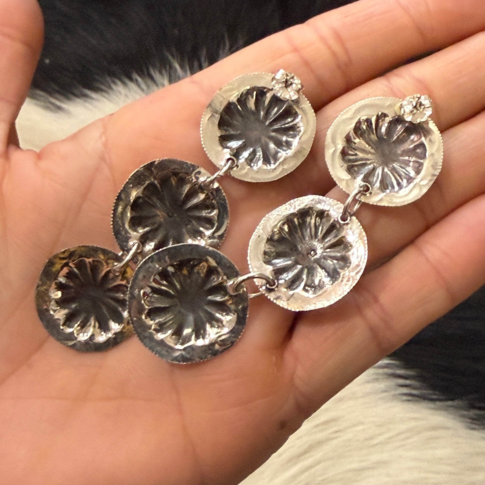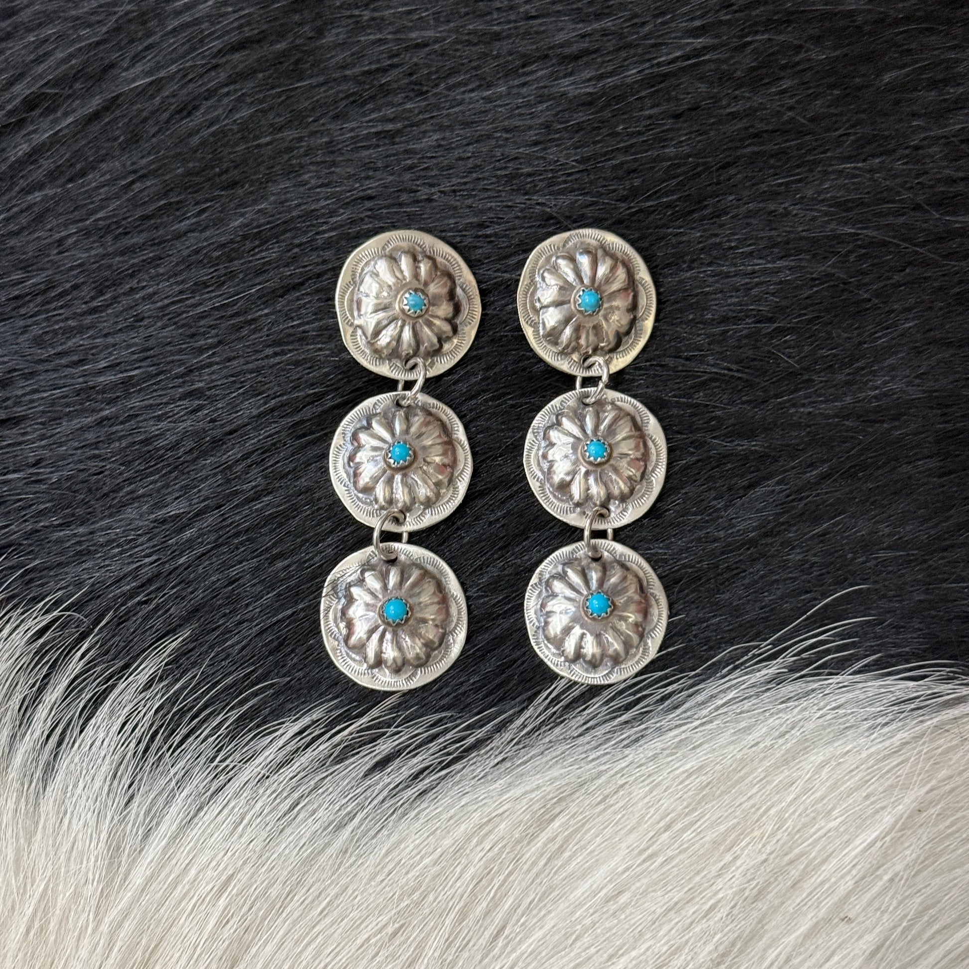 These concho earrings have a post style back and have a drop that features 3 sterling silver conchos, each eith with a dainty Kingman turquoise stone set in the center.